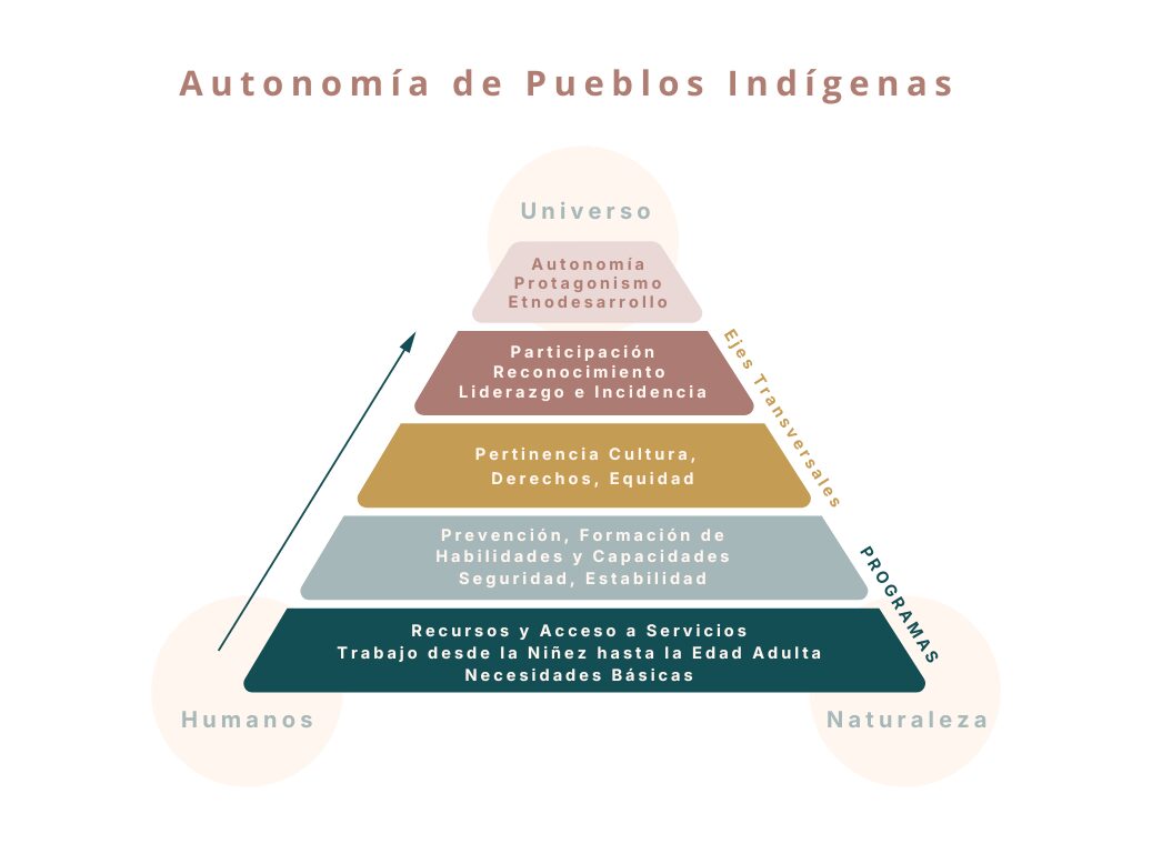 En la cima se encuentra nuestra visión: la autonomía indígena y el etnodesarrollo, alcanzados cuando los tres elementos del triángulo están en equilibrio y las comunidades tienen el poder de dar forma a sus propios futuros.